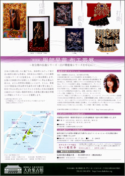 | 2014 Japan Spain Intercommunication 400 Year Anniversary "Sanae Hattori Spain Exhibition" Exhibition report ■ July 18th 2014 to July 19th 2014 ■ Old Royal Palace of Seville in Spain (Guest palace) View the Report Sanae Hattori Textile Crafts Exhibit - a series of Buddha statues on display for the first time, featuring Aizome from the Edo period Date: Saturday 2nd of April 2011 - Sunday 29th of May 2011 Venue: Okura Museum of Museum (in front of Hotel Okura) Displaying various works including the series of Buddha statues which is being unveiled to the public for the first time, along with her uchikake quilts. We look forward to your visit. ■Sanae Hattori Gallery Talk (Commentary on her work) Schedule Dates: 5th, 16th, 19th & 30th of April 2011 10th, 21st, 24th of May 2011 Time: Starts at 14:00 ■Uchikake Fashion Show Date: Tuesday 3rd May (Public Holiday) Time: Starts at 17:30 Admission: 2,000 Yen View the Report |