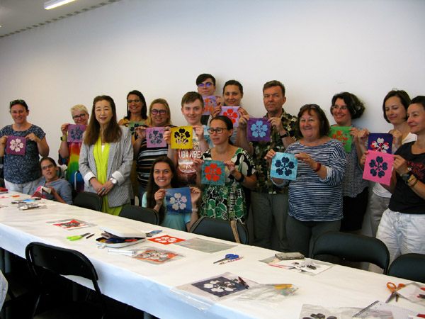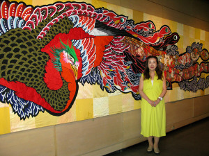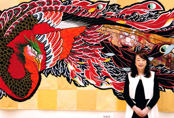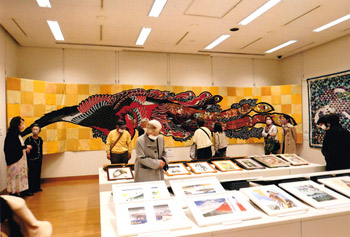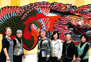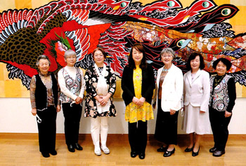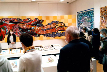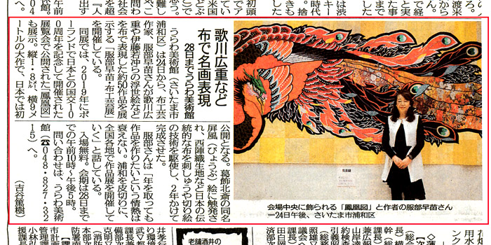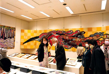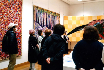 | It was a week when COVID miraculously subsided. Many people were delighted to see the 9 meter wide "Phoenix" by expressing they were impressed to see the beautiful work of art for the first time in a long time, albeit under strict monitoring such as temperature checks by Urawa Art Museum staff, the use of hand sanitiser, name registration, and admission controls. Three newspapers published articles about the exhibition, and some visitors came in with t he newspaper in their hands. We were unable to take pictures with visitors due to social distancing, |